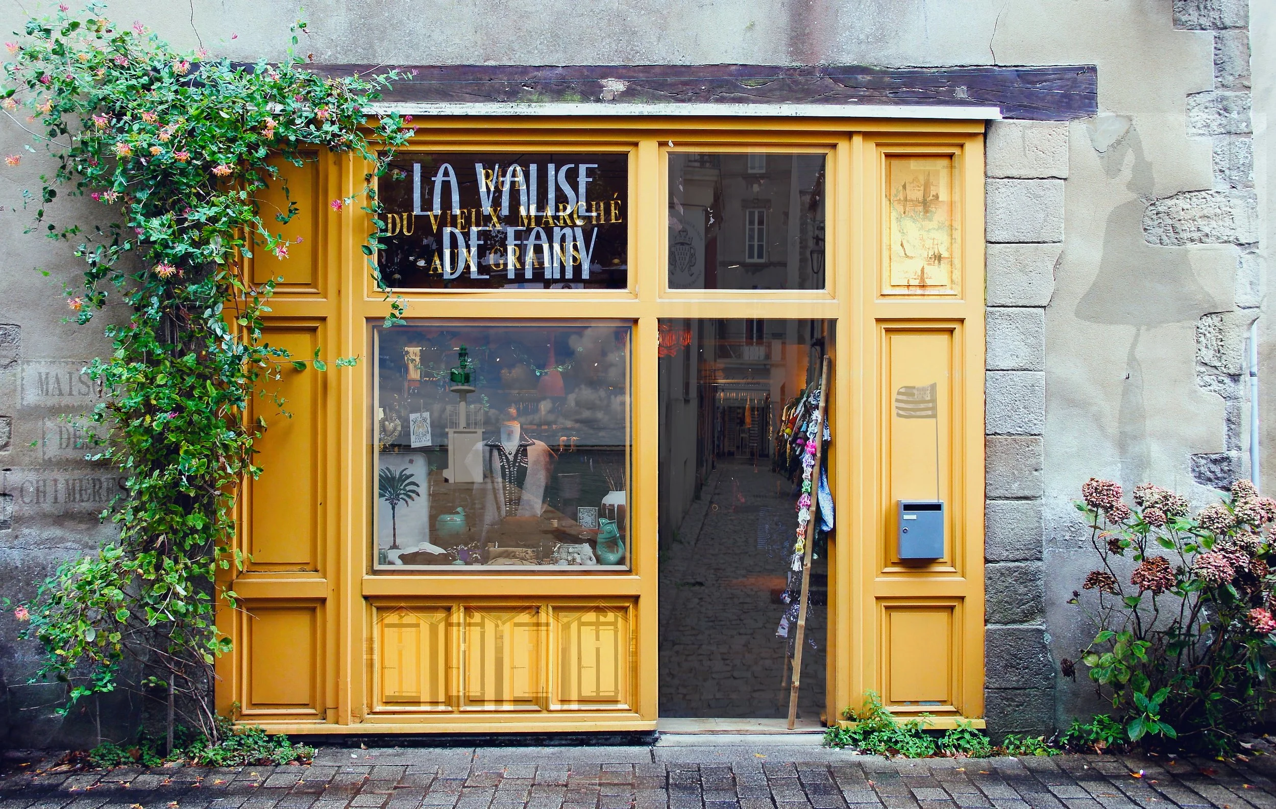 Une façade jaune, marquée par le temps, où la pierre, le végétal et les reflets cohabitent sans chercher à s’effacer.